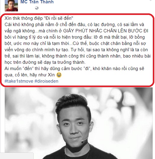 Trấn Thành viết: "X́n thích thông điệp "Đi rồi sẽ đến". Cái khó không phải nằm ở chỗ đến đâu, có lạc đường, có sai lầm và vấp ngă không...mà chính ở giây phút nhấc chân lên bước đi. Bởi v́ hàng tỉ lư do và nỗ lo hiện trong đầu: Lỡ đi mà thất bại lỡ bồng bột, ước mơ này chỉ là tạm thời...Cứ thế, buộc chặt chân bằng nỗi sợ viển vông do chính ḿnh tự tạo. Tự hỏi, tại sao ta không nghĩ là ta c̣n trẻ, sai th́ làm lại, không thành công th́ cũng thành nhân, bao nhiêu bài học trên đường sẽ dạy ta trưởng thành. Ai muốn “đến” th́ hăy dũng cảm bước “đi”, khó khăn nào rồi cũng sẽ qua, cố lên, hăy như X́n".