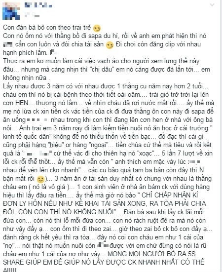 Cụ thể, cậu em chồng tên N.N.N trải lòng: “Mụ đàn bà bỏ con theo trai trẻ. Con nó ốm nó với thằng bồ đi Sapa du hí. Khi về bị anh em phát hiện thì nó không cần con luôn và đòi chia tài sản. Đi chơi còn đăng clip với nhau hạnh phúc lắm.