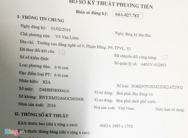 Hồ sơ kỹ thuật chiếc xe mang tên ông Liêm nhưng địa chỉ ở Vĩnh Long.