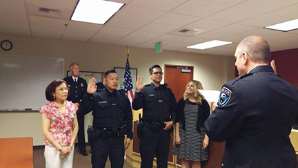 Cảnh sát trưởng Greg Wilson chủ tọa lễ tuyên thệ nhậm chức của Victor Zuniga và David Nguyễn. Huy hiệu của họ được gắn vào sắc phục cảnh sát bởi những người thân trong gia đình.