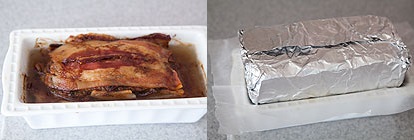 - Lót một lớp thịt hun khói xuống đáy và viền khuôn, đổ hỗn hợp thịt và gan vào và phủ thêm một lớp thịt hun khói nữa lên trên.