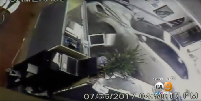 Theo tường trình của đài KCAL, người tài xế bị lạc tay lái, vượt qua bức tường chắn đường, rồi phóng như bay cả 100 ft vào bên trong tiệm.