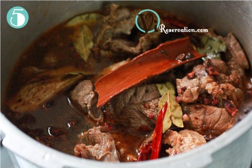 - Cho thịt bò vào một cái xoong sâu hay nồi gang lớn. Thêm các loài gia vị khô và nước trắng hoặc nước dùng vào nồi. Đun to lửa đến khi sôi rồi hạ nhiệt và đun liu riu trong 1 giờ, hoặc đến khi thịt bò được nấu chín kỹ.