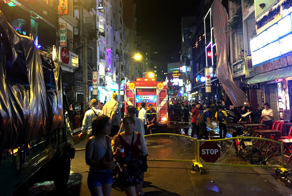 Phía bên ngoài, đường Bùi Viện bị phong tỏa xe để phục vụ công tác chữa cháy. Nhiều du khách ở khu vực phố Tây nháo nhào vì sợ cháy lan.