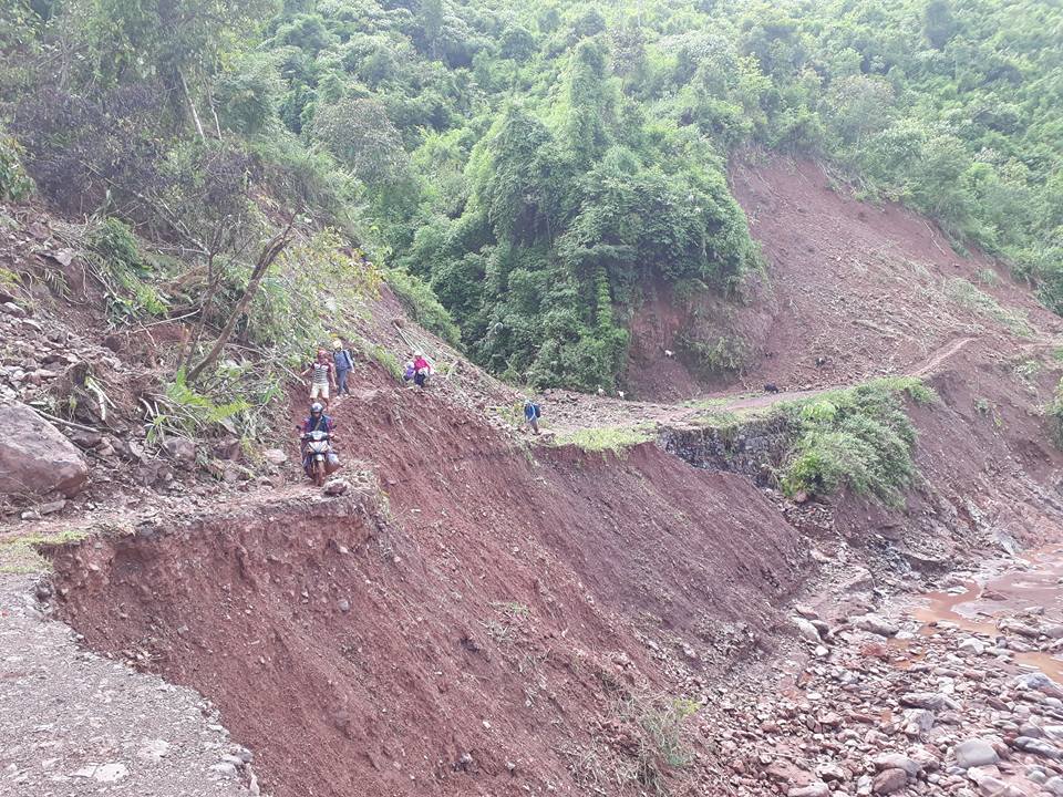 Sau kỳ nghỉ hè, các giáo viên Trường Phổ thông dân tộc bán trú - THCS Nậm Ngà (xã Tà Tổng, huyện Mường Tè, tỉnh Lai Châu) quay trở lại trường chuẩn bị cho năm học mới phải đi qua đoạn ngã ba suối đã bị lũ cuốn mất cống, sạt lở.