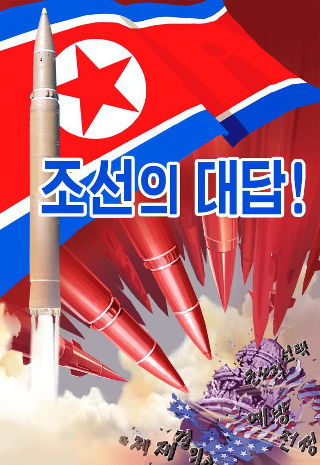 Bức khác cho thấy hàng chục tên lửa đỏ rực của Triều Tiên chĩa vào và phá hủy tòa nhà quốc hội của Mỹ ở Washington đi kèm với chú thích: “Câu trả lời của chúng tôi”.