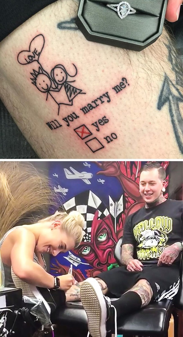 Vinnie Capaldo-Smith đã cầu hôn bạn gái của mình- Brooke Wodark (vốn là một người thợ xăm) bằng cách xăm mình. Vinnie đã yêu cầu bạn gái xăm cho mình theo bức tranh mẫu với dòng chữ: “Em sẽ lấy anh chứ?” với 2 câu trả lời “Có”, “Không”. Brooke cuối cùng đã đánh dấu vào ô “Có”.