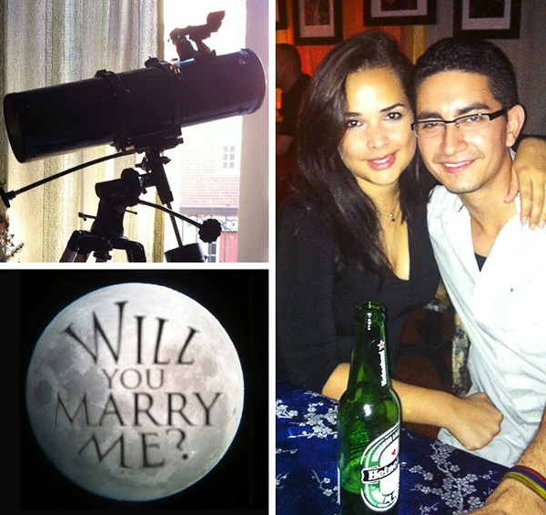 Để cầu hôn bạn gái, chàng trai này đã chế tạo ra một ống kính viễn vọng với dòng chữ: “Em sẽ lấy anh nhé” và mời bạn gái nhìn vào kính để ngắm mặt trăng.