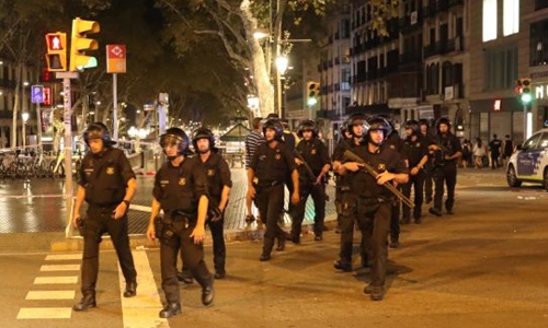 Cảnh sát Tây Ban Nha tại hiện trường vụ đâm xe khủng bố ở Barcelona.