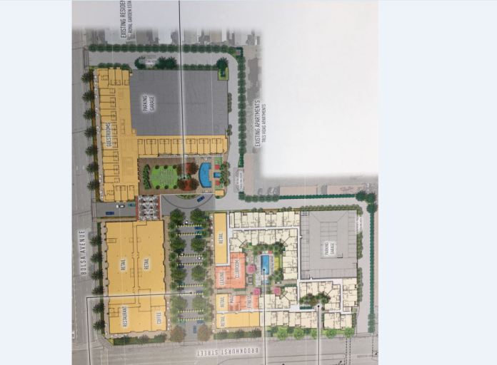 H́nh phác họa dự án, nh́n từ góc đường Bolsa và đường Brookhurst. (H́nh: Linh Nguyễn/Người Việt)