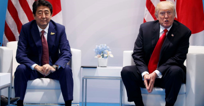 Tổng thống Mỹ Donald Trump (phải) phát biểu trong một cuộc hội kiến Thủ tướng Nhật Bản Shinzo Abe tại hội nghị Thượng đỉnh G20, ngày 8 tháng 7, 2017, ở Hamburg, Đức. Ảnh AP