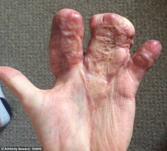 Hiện tại anh mới trải qua thêm 2 cuộc phẫu thuật để tách khối ngón tay làm 3. Anh còn phải tách ngón thêm 1 lần và phẫu thuật tạo hình - ảnh DAILY MAIL
