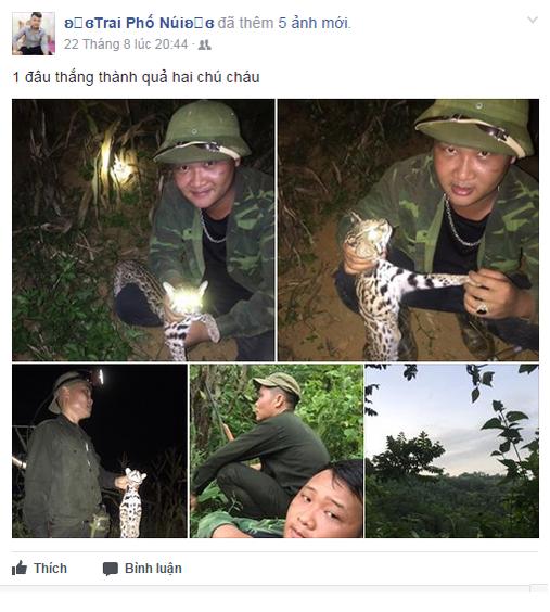 Theo phản ánh, ngày 22/8, nam thanh niên tên Tuấn Anh (trú tại xã Thạch Quảng, huyện Thạch Thành, tỉnh Thanh Hóa) sử dụng tài khoản facebook "Trai phố núi" đăng tải hình ảnh giết hại mèo rừng rồi đưa lên face book để khoe. Được biết, con mèo rừng này được nam thanh niên này cùng một người nữa bắt được trong một lần đi săn từ trước đó.