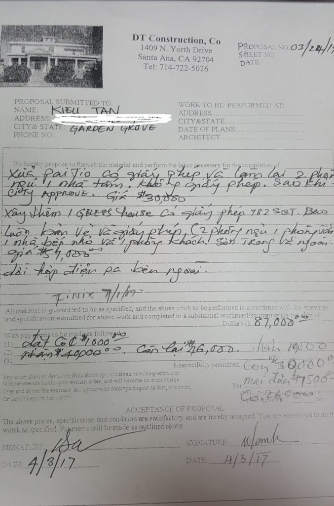 “Tôi gọi hỏi một vài người theo quảng cáo trên báo, trong đó có ông Điền Nguyễn, người ghi là có công ty xây dựng DT Construction ở Santa Ana. So với những người khác, ông Điền cho giá rẻ hơn. Trong khi lưỡng lự còn chưa biết nên chọn ai thì ông Điền cứ gọi điện thoại hoài và hứa hẹn nhiều điều, cộng với việc muốn làm cho xong vì sợ đến ngày thành phố xuống kiểm tra lại, nên tôi chọn đại ông ta,” chị Kiều bắt đầu câu chuyện.