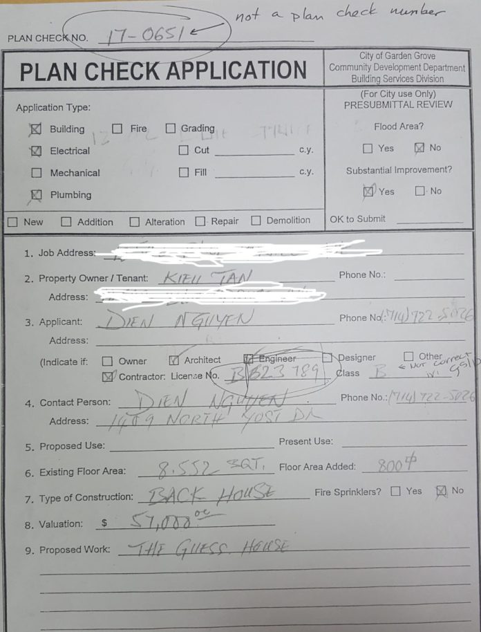 Số “plan check” ông Điền ghi trong cái tờ “Plan check Application” là giả. Kiểm tra số license của người hành nghề xây dựng mà ông Điền cung cấp cũng là giả.