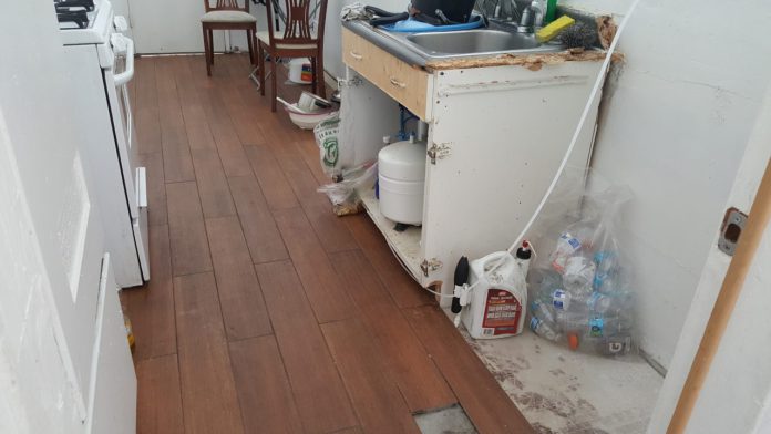 Nhà bếp bị tháo ra và làm dang dở (Hình: Ngọc Lan/Người Việt)