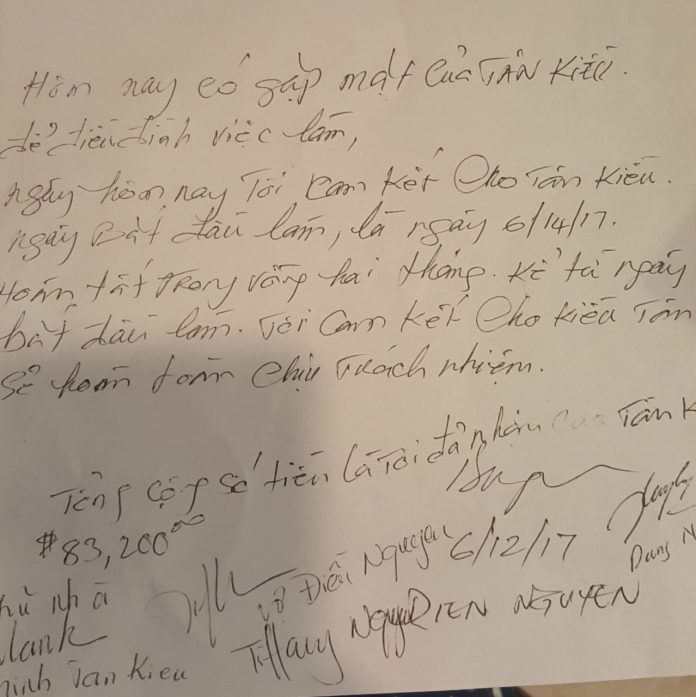 “Hôm nay có gặp mặt của Tân Kiều để điều đình việc làm. Ngày hôm nay tôi cam kết cho Tân Kiều ngày bắt đầu làm là ngày 6/14/17. Hoàn tất trong vòng hai tháng kể từ ngày bắt đầu làm. Tôi cam kết cho Kiều Tân sẽ hoàn toàn chịu trách nhiệm. Tổng cộng số tiền tôi đã nhận của Tân Kiều là $83,200.”