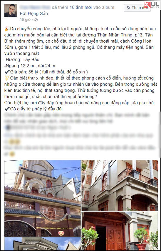 Căn nhà “đặc biệt”, theo như chủ nhân bài viết chia sẻ, chính xác là một căn biệt thự nằm trên con hẻm đường Thân Nhân Trung, phường 13, quận Tân Bình. Và mức giá 55 tỉ được đưa ra dựa trên những đặc điểm: Biệt thự được thiết kế theo phong cách cổ điển với đầy đủ nội thất và đồ gỗ xịn.