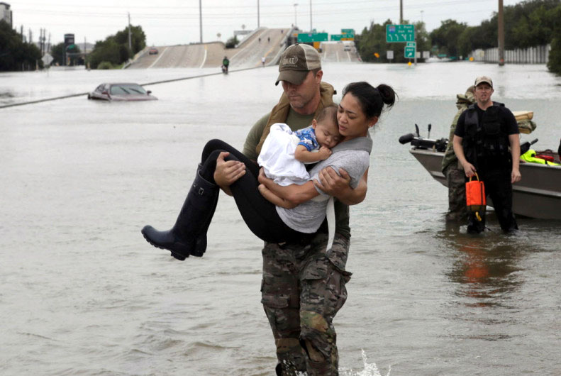 Cảnh sát viên Daryl Hudeck thuộc lực lượng SWAT đang bế mẹ con cô Connie Phạm và bé trai Aiden ra khỏi vùng bị lụt ở tây nam Houston sáng Chủ Nhật, 27 tháng 8, 2017. Trong vòng một ngày sau, bức ảnh này của ông David J. Phillip chụp cho hãng AP đã được lan truyền khắp thế giới, trở thành tấm ảnh tiêu biểu cho tinh thần phấn đấu của người Houston trước thảm họa thiên tai. (AP)