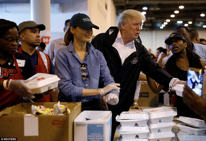 Trong chuyến đi này, điểm đầu tiên mà vợ chồng Tổng thống Donald Trump đã ghé thăm là Sân vận động NRG tại Houston, nơi hàng nghìn người dân đang tập trung sau khi sơ tán khỏi những căn nhà ngập nước do bão Harvey gây ra vào đầu tuần.