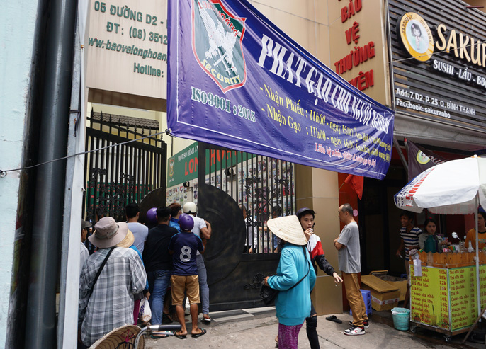 11 giờ - buổi phát gạo miễn phí cho người nghèo diễn ra nhưng trước đó, những người bán vé số, chạy xe ôm, gánh hàng rong… chỉ thưa thớt, trong khi ngược lại, hàng chục thanh niên dừng xe máy trước cổng, đập cửa ầm ầm chực lao vào