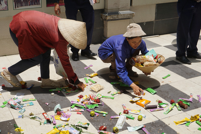 Nhặt lại đồ ăn, bánh kẹo...vương vãi sau "lễ giật tiền"