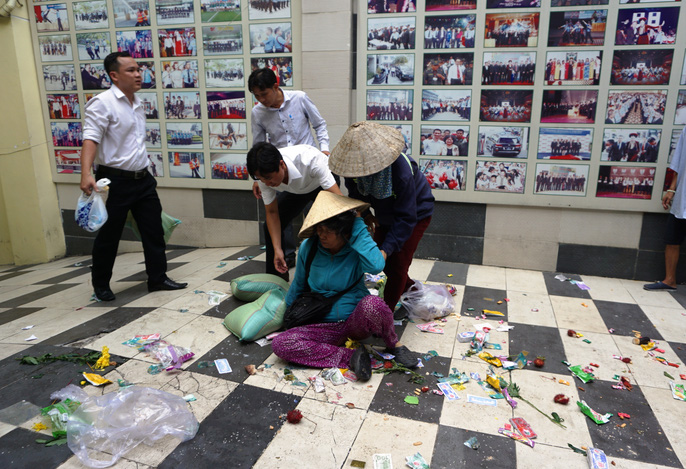 Nữ nhân viên chưa rải tiền, đồ cúng nhưng thanh niên này lao theo giành giật