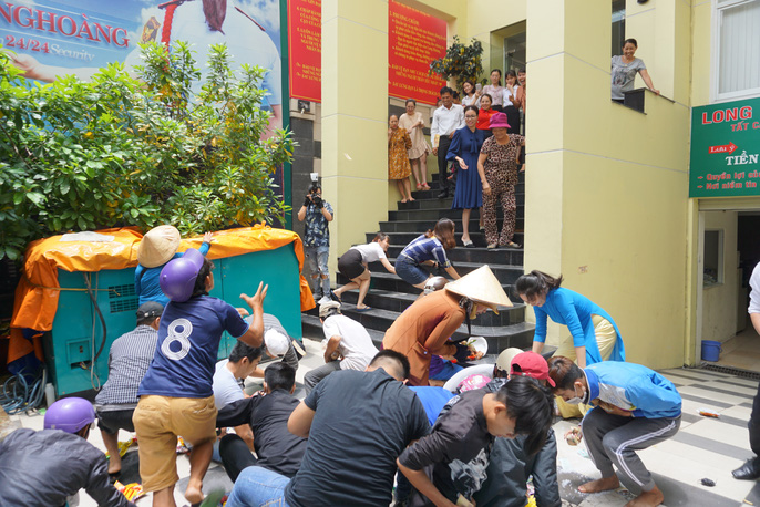 Nhân viên công ty khi mở cửa và rải tiền loại mệnh giá 10.000 đồng sau lễ cúng thì dòng người ùa vào, miệng la hét, tay vung lên, xô đẩy, giẫm đạp lên nhau để giành giật