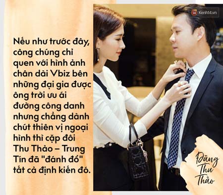 Nếu như trước đây, công chúng chỉ quen với hình ảnh chân dài Vbiz bên những đại gia được ông trời ưu ái đường công danh nhưng chẳng dành chút thiên vị ngoại hình thì cặp đôi Thu Thảo – Trung Tín đã "đánh đổ" tất cả định kiến đó. Sánh đôi bên "Hoa hậu của các Hoa hậu" là một chàng trai vô cùng điển trai, tài giỏi và thành đạt. Dù mới 28 tuổi nhưng Trung Tín đã nắm trong tay nhiều cơ sở kinh doanh lớn nhỏ. Không những thế, bạn trai Thu Thảo còn có mặt trong Top 30 người trẻ nổi bật dưới 30 tuổi do tạp chí Forbes Việt Nam bầu chọn. Nếu phải minh chứng cho câu "trai tài gái sắc", Thu Thảo – Trung Tín thật sự là một cặp đôi đáp ứng mọi tiêu chí.
