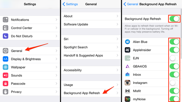 Cũng giống như trên, Background App Refresh có thể khiến điện thoại tốn nhiều pin vì nó sẽ cho phép ứng dụng chạy ngầm và làm mới (refresh) ngay cả khi người dùng rời khỏi ứng dụng. Hãy điều chỉnh việc này bằng cách vào Settings > General > Background App Refresh và chọn lọc những ứng dụng bạn cho phép/không cho phép chạy ngầm.