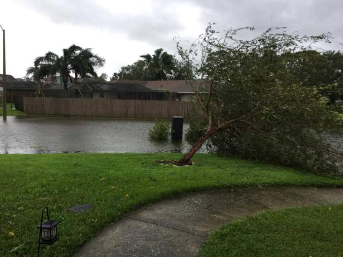 Cây tróc gốc và nước ngập trước nhà ở Belle Isle, Orlando sau khi bão Irma đi qua.