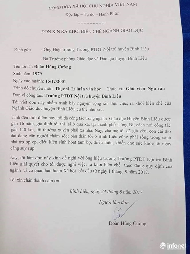 Đơn xin ra khỏi ngành biên chế giáo dục của thầy Đoàn Hùng Cường