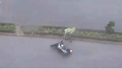 Lúc 9h, tại khu vực gần cầu Nhật Lệ, Đồng Hới, Quảng Bình, một người đàn ông cố gắng chạy xe máy nhưng do gió tạt mạnh khiến cả người và xe ngã nhào ra đường.