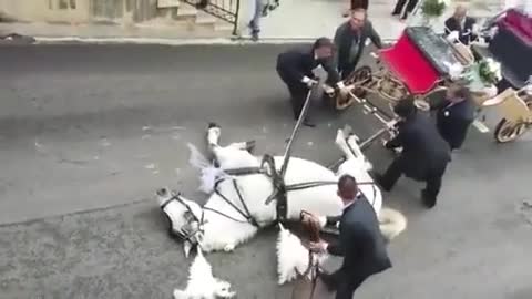 Sau khi con vật bất tỉnh, nhiều người diện Âu phục bao gồm chú rể chạy lại kiểm tra tình hình và tháo phần càng xe ra khỏi cơ thể con bạch mã.