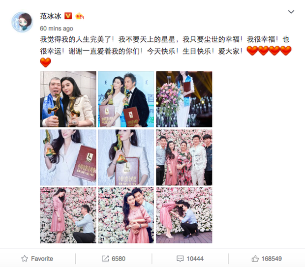 Trên trang Weibo, Phạm Băng Băng viết: "Tôi cảm thấy cuộc sống của tôi đã hoàn hảo. Tôi không cần những vì sao trên bầu trời, tôi chỉ muốn có được hạnh phúc nơi hồng trần mà thôi. Tôi cảm thấy vô cùng hạnh phúc và may mắn. Cám ơn tất cả mọi người. Hôm nay thật vui quá. Sinh nhật vui vẻ! Yêu tất cả mọi người".