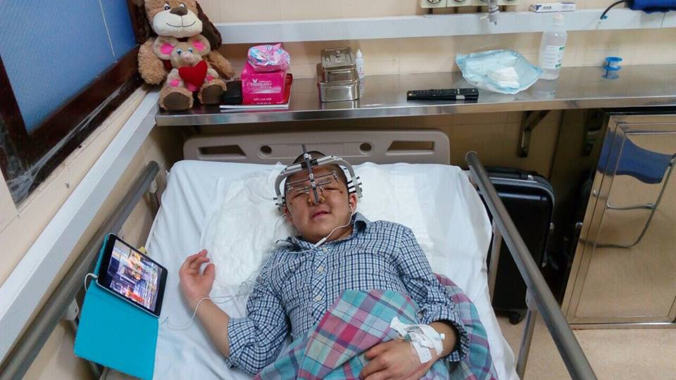 - Ca mổ gần 8 tiếng, khi tôi quyết định mổ rất nhiều người phản đối quyết liệt vì các giáo sư Hàn và Úc đều nói là phải 17-18 tuổi mới làm được. Trong khi đó hàm trên của Bôm ngày càng tụt vào trong, ảnh hưởng rất nhiều đến chức năng nói và ăn uống, khuôn mặt cũng bị ảnh hưởng.