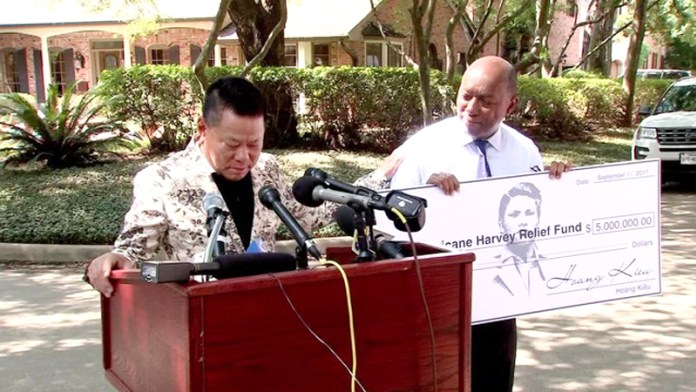 HOUSTON, Texas (NV) – Tỷ phú Hoàng Kiều vừa tặng một chi phiếu $5 triệu cho Quỹ Phục Hồi Bão Harvey tại một cuộc họp báo ở đường Hallie, thành phố Houston, hôm Thứ Hai, 11 Tháng Chín 2017.
