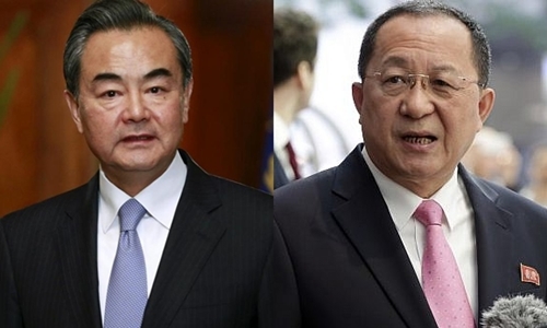 Ngoại trưởng Trung Quốc Vương Nghị (trái) và người đồng cấp Triều Tiên Ri Yong-ho. Ảnh: Reuters/AP.