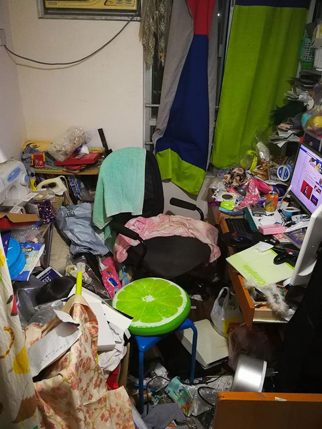 Chỉ một bức ảnh nhưng có thể thấy, cả căn phòng đều tràn ngập đồ, đồ sạch, đồ bẩn để chung với nhau, cực kỳ lộn xộn. Từ quần áo, khăn mặt, cây cảnh đến đồ uống, vỏ đồ uống, các loại rác thải... tất cả đều nằm trong một mớ hỗn độn, hoàn toàn không nhìn thấy đường để bước đi.