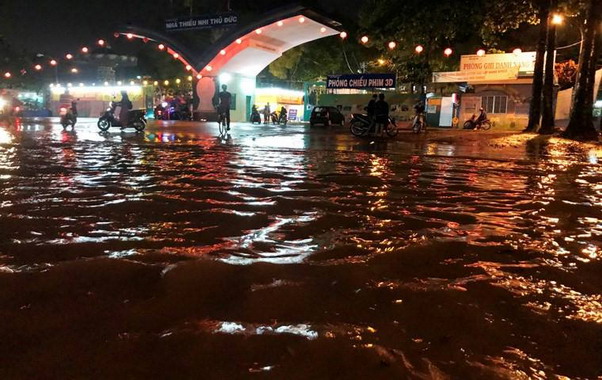 Trên đường Võ Văn Ngân, tại khu vực trước Nhà Thiếu nhi Thủ Đức (đoạn từ nút giao đường số 6 đến Nhà Thiếu nhi, thuộc phường Linh Chiểu, quận Thủ Đức), nước mưa lênh láng như con sông khiến người tham gia giao thông khốn đốn.