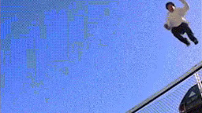 Thành Long chuẩn bị trượt xuống từ tòa nhà 21 tầng với thiết bị bảo vệ duy nhất là tấm thảm "nhỏ như lòng bàn tay" ở bên dưới và chiếc áo da nhằm giảm tốc độ trượt