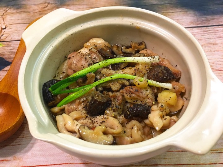 Gà lọc lấy phần thịt, thái miếng nhỏ vừa ăn ướp với 1 thìa nước mắm, 1 thìa hạt nêm chay vị nấm hương, 1 thìa dầu hào trong vòng 15 phút cho ngấm gia vị. Nấm hương khô ngâm trong nước nóng cho nở rồi rửa sạch thái làm đôi. Bắc chảo lên bếp phi thơm hành khô băm nhỏ với dầu ăn rồi cho nấm hương vào xào tầm 2 phút, sau đó cho thịt gà vào đảo đều, đậy vung lại rim nhỏ lửa cho thịt gà ra nước và mỡ. Khi thịt gà chín mềm thì nêm nếm lại gia vị cho vừa miệng, rắc thêm chút tiêu đen vào cho thơm. Dùng nóng với cơm trắng sẽ rất ngon.