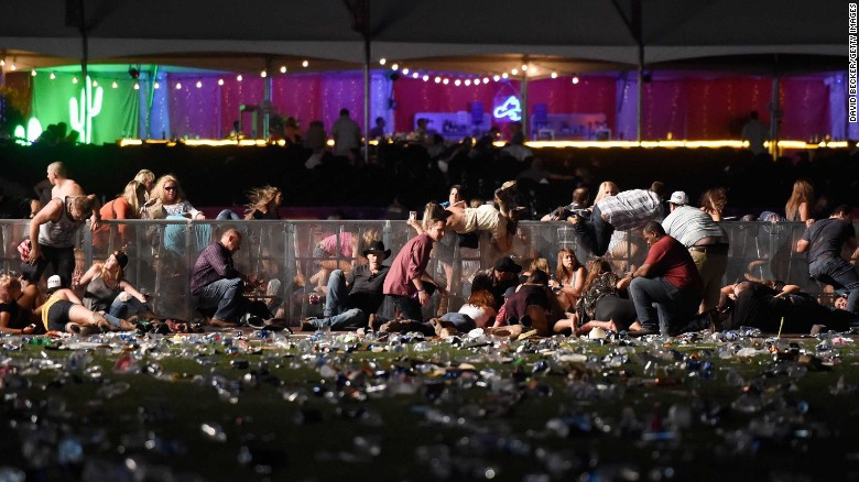 Người tham dự hòa nhạc tại Las Vegas nấp sau hàng rào trong vụ xả súng tối 1/10 ở Mỹ. Ảnh: Getty.