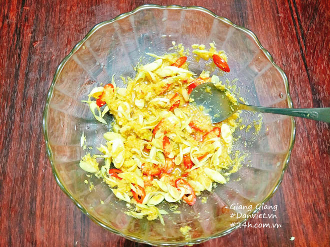 - Bước 4: Cho nước mắm, nước cốt quất, sả, ớt, muối, đường, dấm và hỗn hợp riềng vừa xay nhuyễn vào tô rồi trộn đều.