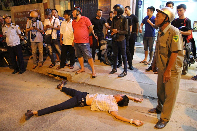 Tài xế vờ cắn lưỡi rồi lăn ra đường ăn vạ. ẢNH: ĐỨC TIẾN