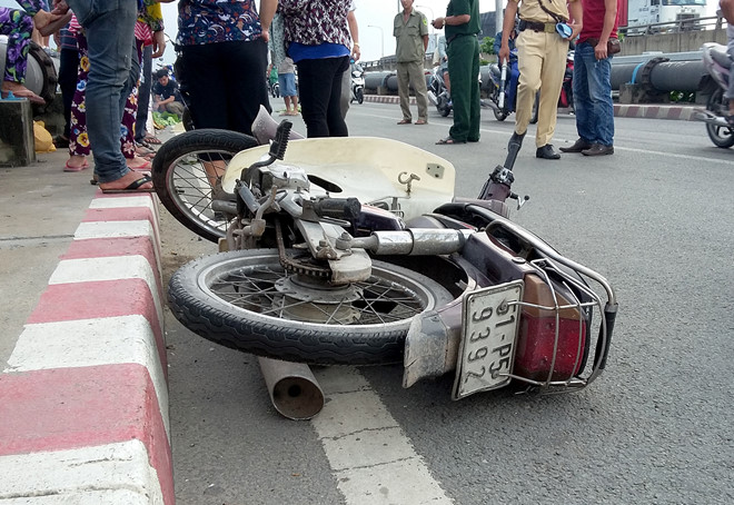 Khi đang đổ dốc cầu Bình Phước, quận Thủ Đức, xe máy của anh Hoan bất ngờ ngã và trượt dài trên cầu. Sự cố khiến nạn nhân tử vong cách chiếc xe máy gần 10 m.