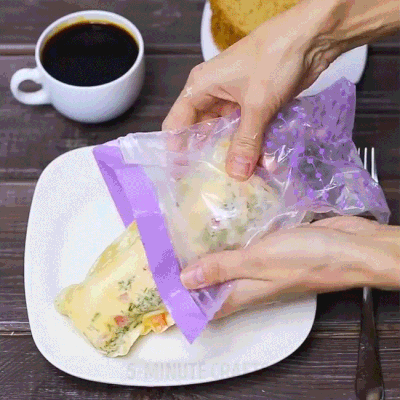 - Trước tiên, bạn đập trứng vào túi zipper và cho gia vị, rau củ, hành lá, rau thơm cắt nhuyễn tùy ý vào.