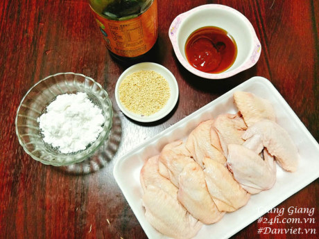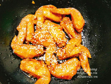 - Bước 5: Đặt chảo sạch lên bếp cùng với khoảng 1 thìa dầu ăn, dầu đã nóng thì bạn cho nước tương, tương cà, mật ong, khoảng 3-4 thìa nước rồi khuấy đều, nấu cho nước sốt mật ong vừa sôi thì trút tất cả cánh gà vào đảo đều cho cánh gà bám đều nước sốt là tắt bếp, rắc 1 chút vừng trắng chín lên trên.