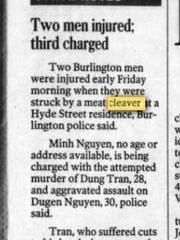 Bản tin cũ về vụ chém bằng dao phay (meat cleaver) đăng trên báo The Burlington Free Press số ngày 27 tháng 11, 1999.