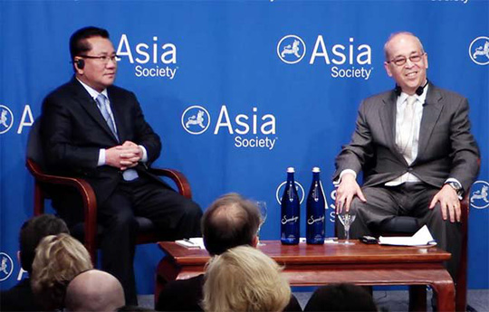 Ông Ri Jong-ho (trái) phát biểu tại một sự kiện của Hiệp hội châu Á tại TP New York – Mỹ hôm 16-10. Ảnh: TWITTER